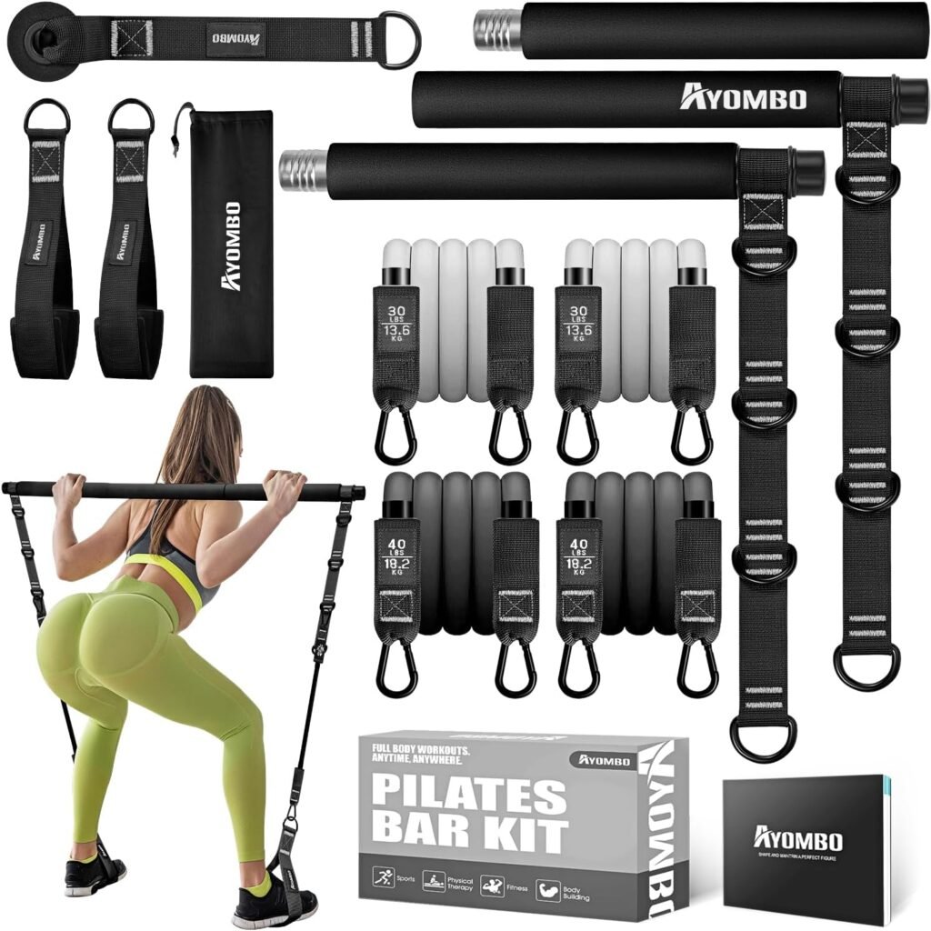 Pilates Bar Kit with Resistance Bands, Pilates Workout Equipment for Legs, Hip, Waist, Arm, Squats Exercise Equipment for Home Workouts, Adjustable 3-Section Pilates Bar Kit for Women & Men